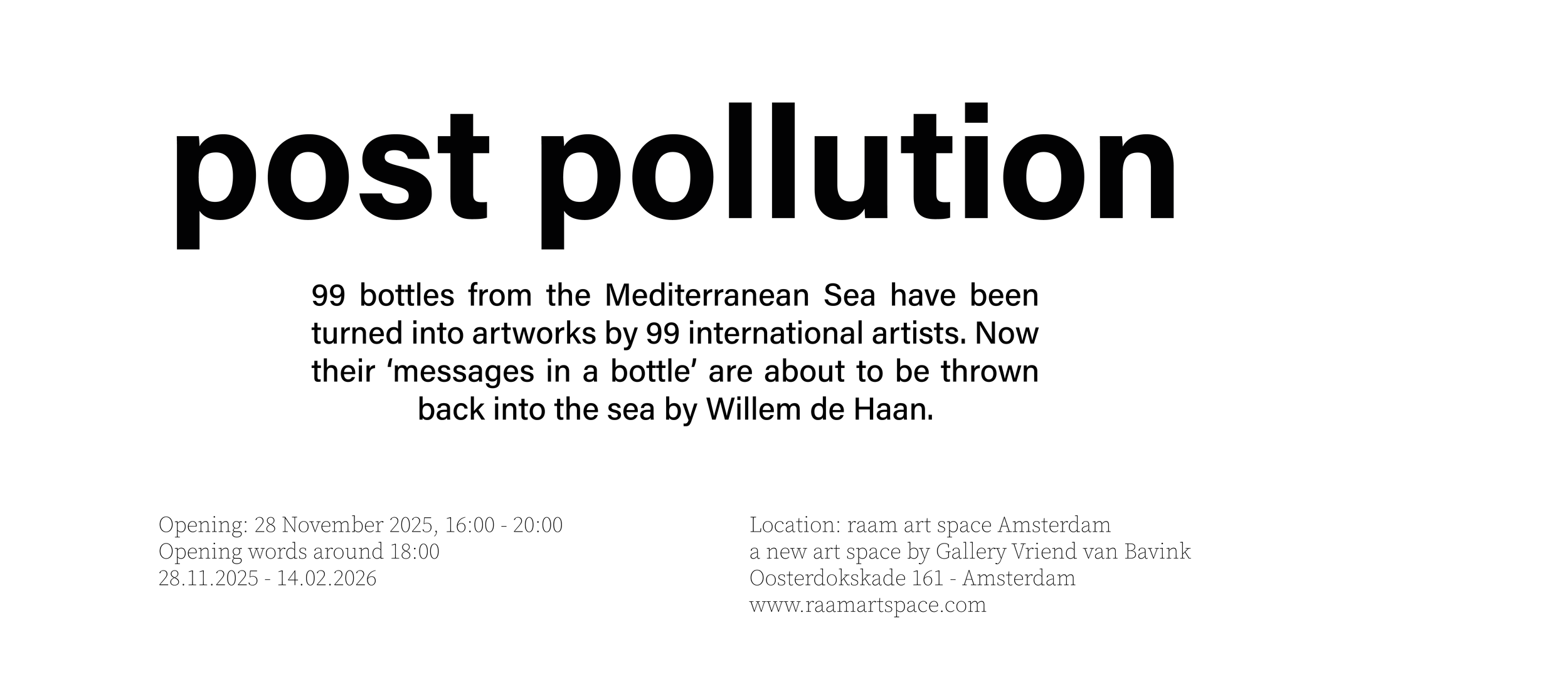 On November 28, a new art space will open in the heart of Amsterdam. Gallery Vriend van Bavink launched ‘raam art space amsterdam’ with the exhibition Post Pollution by Willem de Haan and 99 artists.